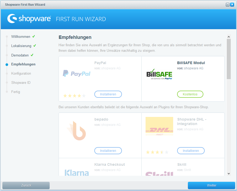 Wir empfehlen unseren Kunden an dieser Stelle die Installation von PayPal, TrustedShops 2.0 und der Google Integration. Bei Dir kann dies eine ganz andere Auswahl sein. Du hast zu einem späteren Zeitpunkt die Möglichkeit sämtliche Plugins aus dem Community Store über den Plugin Manager zu installieren.
