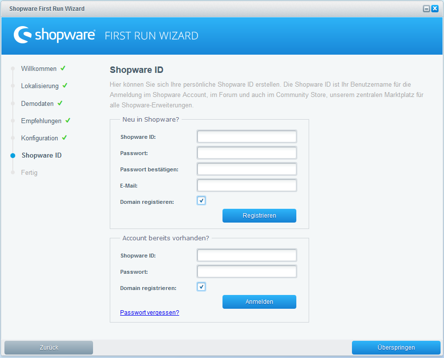 Trage hier Deine Shopware ID ein oder erstelle eine neue Shopware ID. Dies ist notwendig, wenn Du später Plugins und Updates aus dem Community Store herunterladen möchtest. Bei einer Professional oder Professional Plus Edition empfehlen wir diesen Schritt immer.