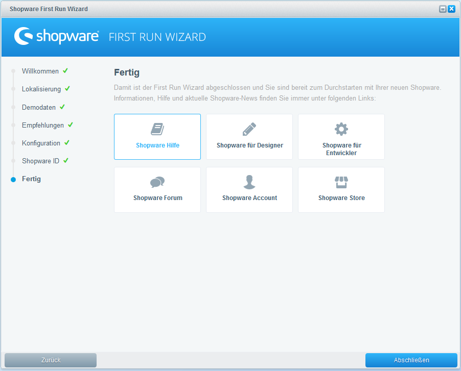 Du hast vermutlich gerade Deine Installation abgeschlossen und bist im First Run Wizard angekommen. Hier kannst Du alle Grundeinstellungen Deines Shops treffen und erste Plugins installieren.