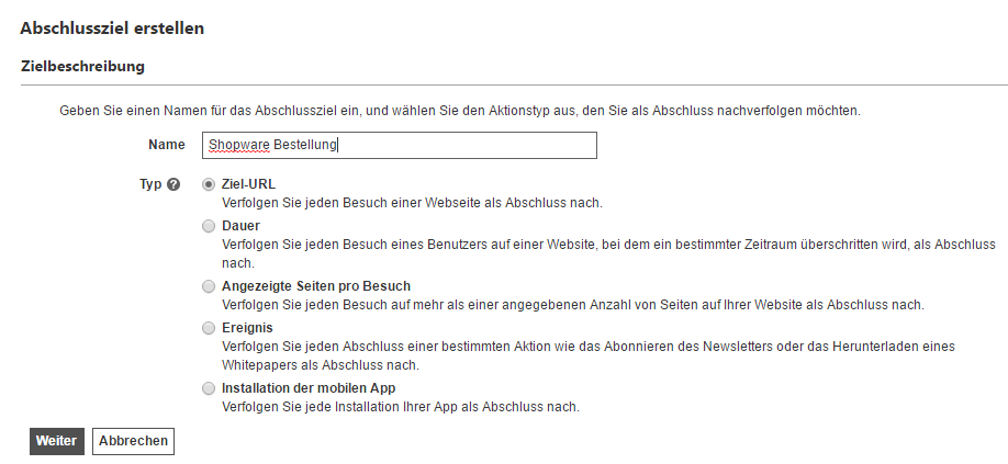 Gehe nun zu den Abschlusszielen und erstelle ein neues Abschlussziel. Als Name kannst Du „Shopware Bestellung“ angeben. Wähle als Typ die „Ziel-URL“ und klicke anschließend auf weiter.