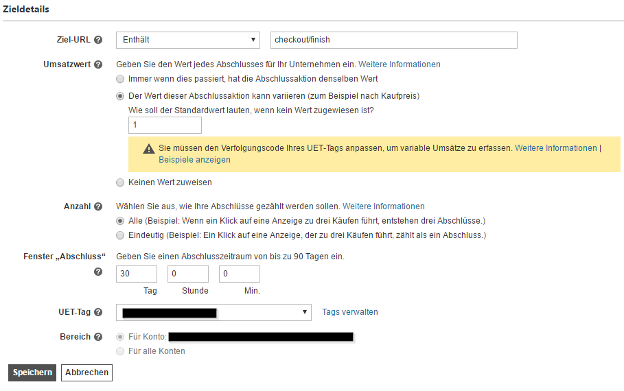 Lege nun die Zieldetails fest. Wichtig ist hierbei, dass die Ziel-URL auf Enthält checkout/finish eingestellt ist. Um den Warenkorbwert ebenfalls in Bing zu sehen, wählst Du bei Umsatzwert die Option Der Wert dieser Abschlussaktion kann variieren. Dadurch wird gewährleistet, dass das Bing Ads Plugin den Wert übermitteln kann.