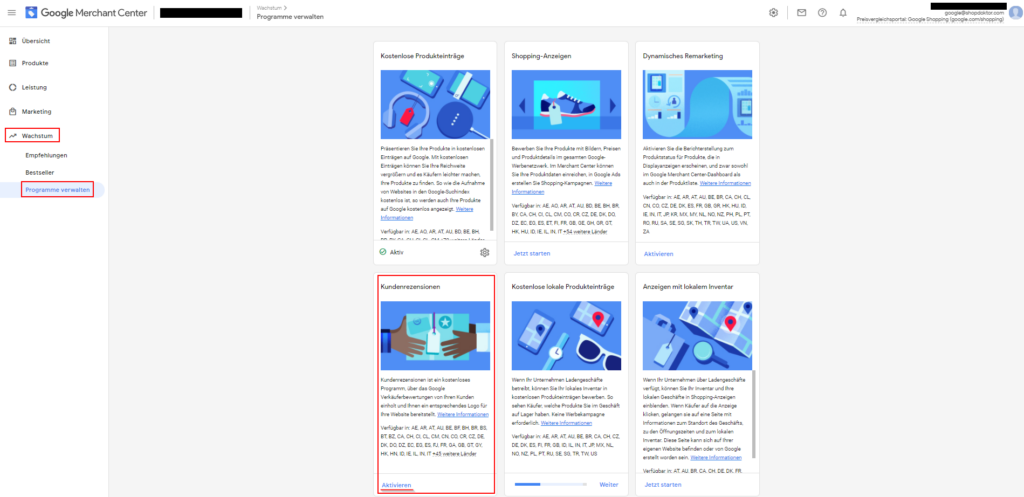Melde Dich dazu auf Deinem Google Merchant Konto an und gehe im Menü unter „Wachstum“ und „Programme verwalten“. Dort findest Du eine Kachel mit dem Titel „Kundenrezensionen“ über die Schaltfläche „Aktivieren“ kannst Du Deine Kundenrezensionen einrichten.