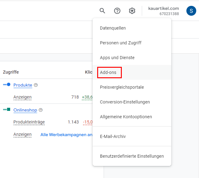 Gehe über das Einstellungs-Symbol und wähle den Menü-Punkt „Add-ons“ aus.