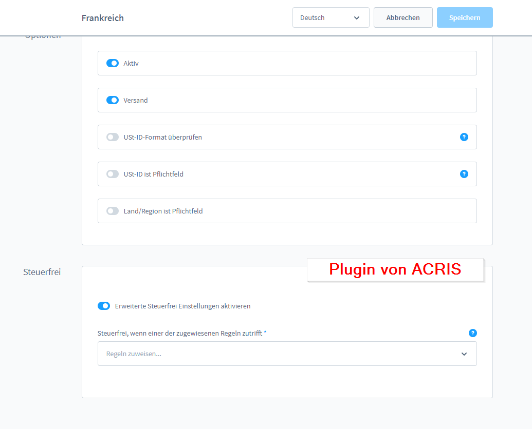 | Zusätzliche Einstellungen bei Ländern? | Regel kann hinterlegt werden | Keine weiteren Einstellungen |