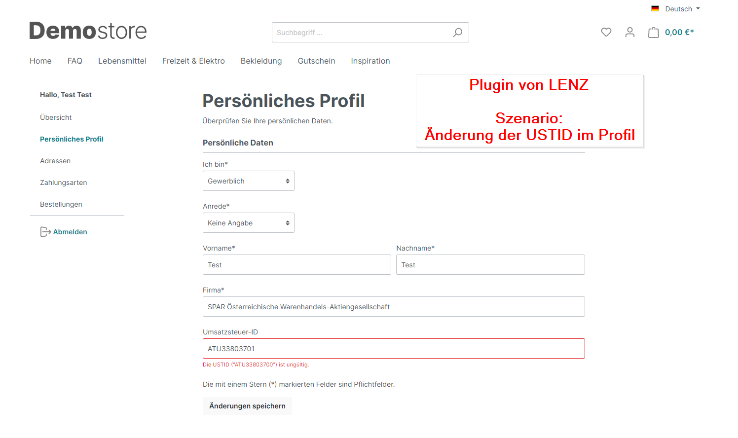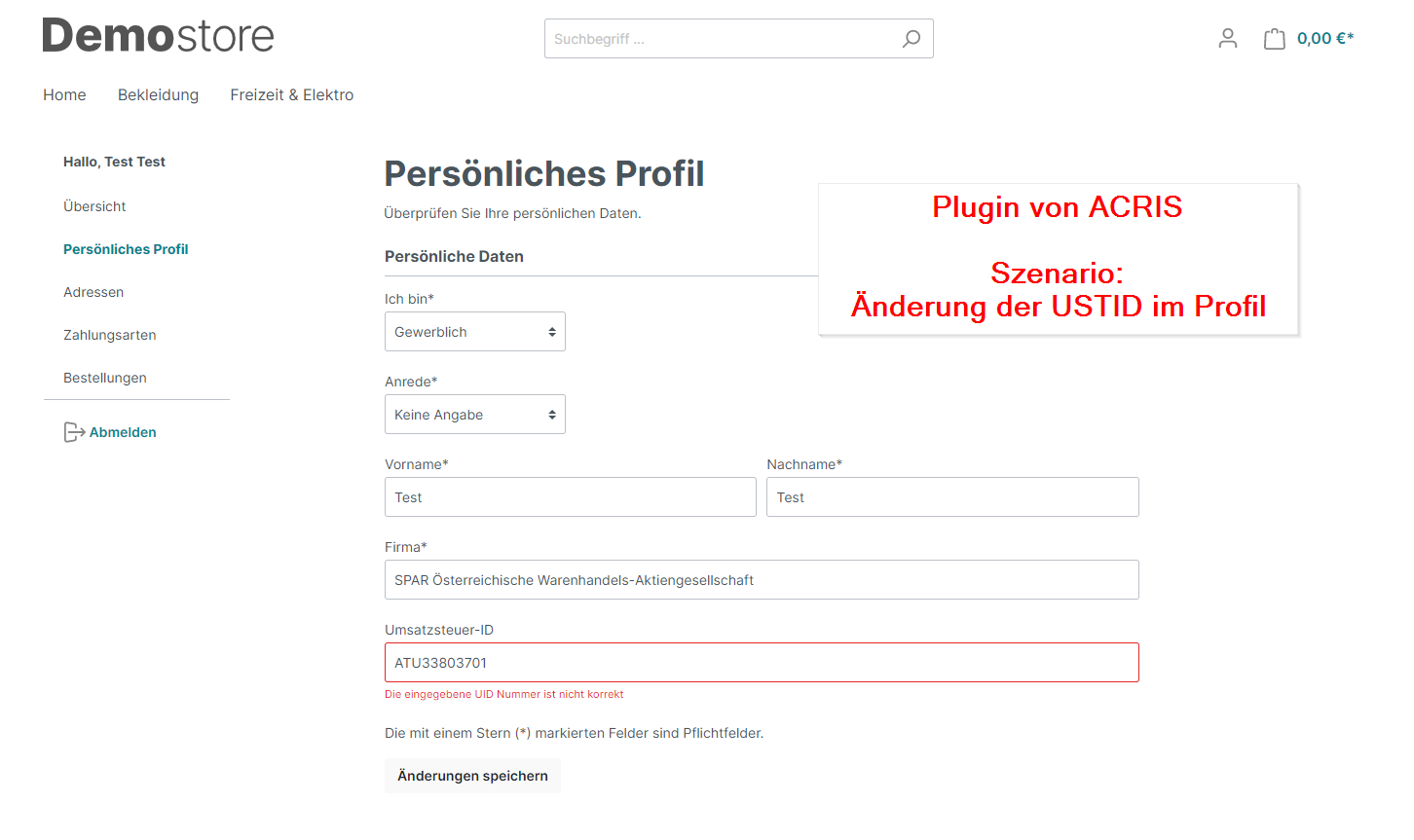 | Änderung der USTID im Profil (letzte Zahl geändert) | Hinweis erscheint: „Die eingegebene UID Nummer ist nicht korrekt“ | Hinweis erscheint: „Die USTID (..) ist ungültig.“ |