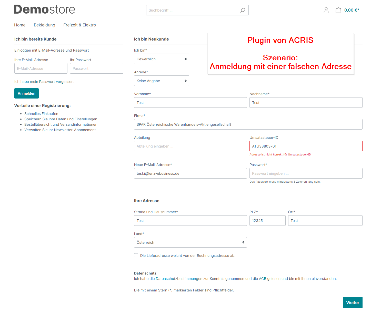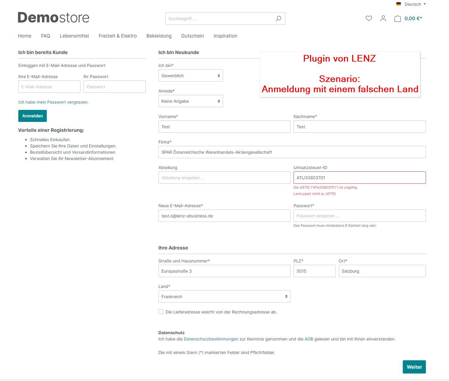 | Anmeldung mit einem falschem Land | Hinweis erscheint: „Adresse ist nicht korrekt für Umsatzsteuer-ID“ | Hinweis erscheint: „Die USTID (..) ist ungültig. Land passt nicht zur USTID.“ |