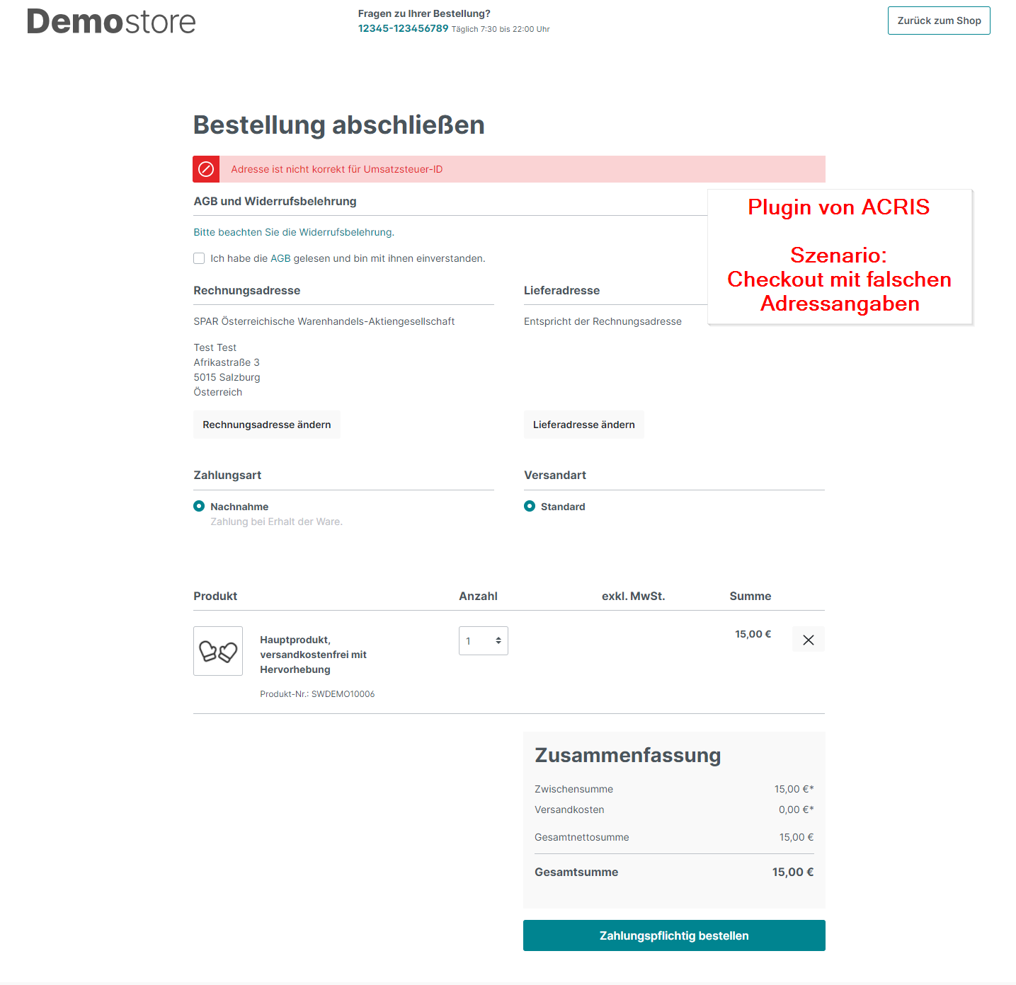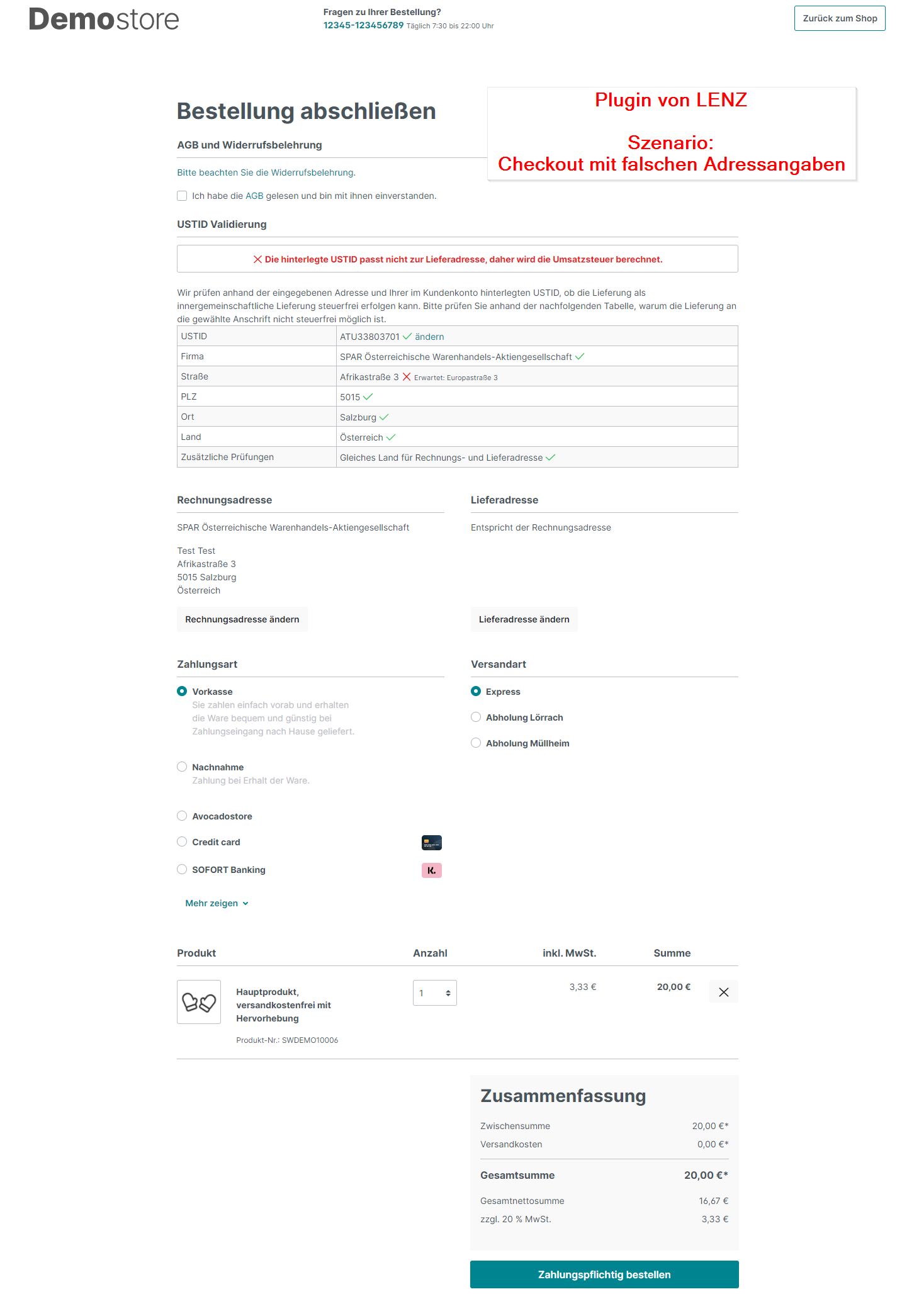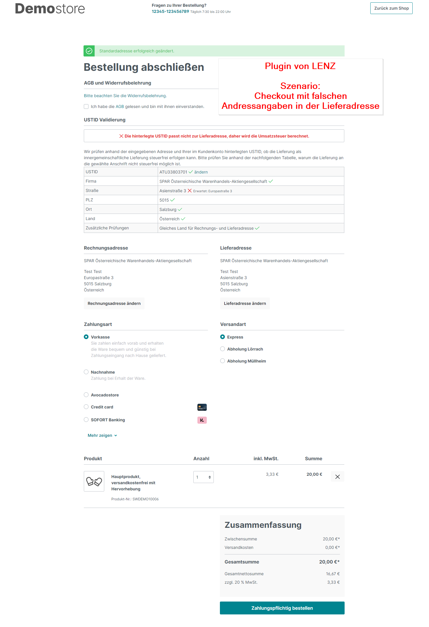| Checkout mit falschen Adressangaben (ohne abweichende Lieferadresse) | Hinweis erscheint: „Adresse nicht korrekt für Umsatzsteuer-ID“ Anmerkung: Nach Korrektur wird die Bestellung automatisch abgeschlossen. | Geprüft: Lieferadresse Hinweis erscheint: „Die hinterlegte USTID passt nicht zur Lieferadresse, daher wird die Umsatzsteuer berechnet.“ |