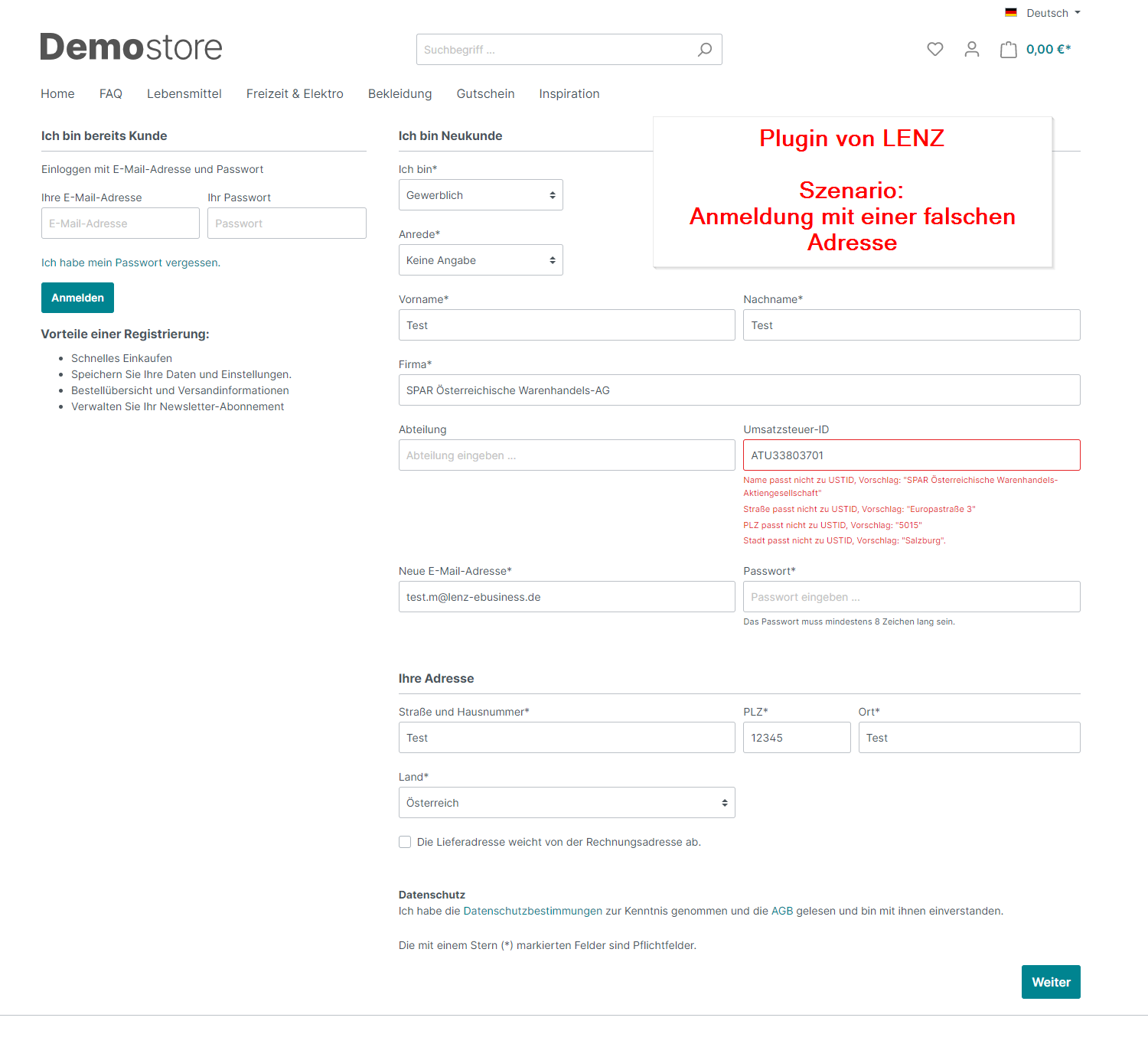 | Anmeldung mit einer falscher Adresse | Hinweis erscheint: „Adresse ist nicht korrekt für Umsatzsteuer-ID“ | Hinweis erscheint und genaue Auflistung welche Felder nicht zur USTID passen mit Korrekturvorschlag |