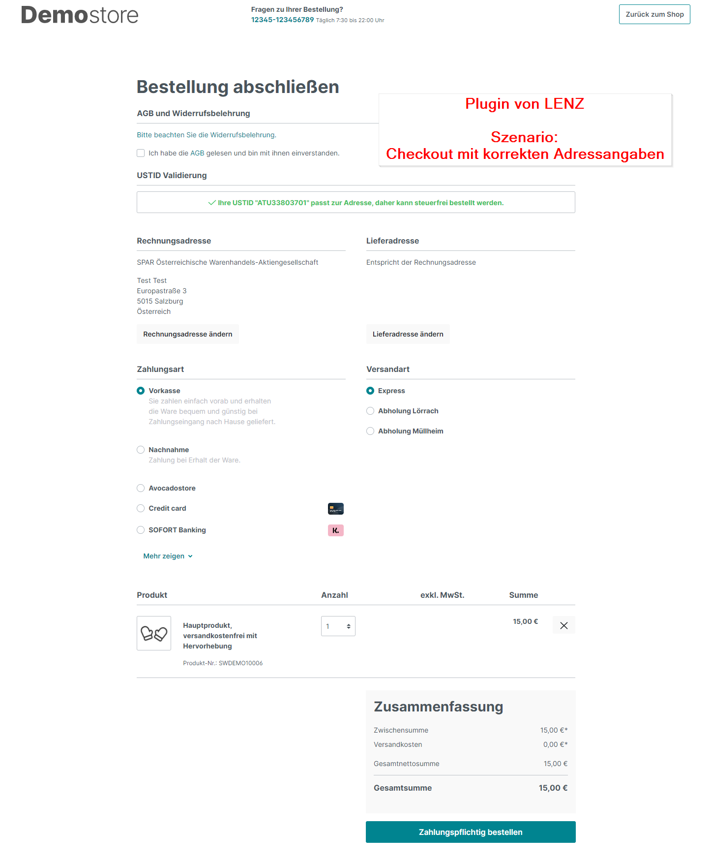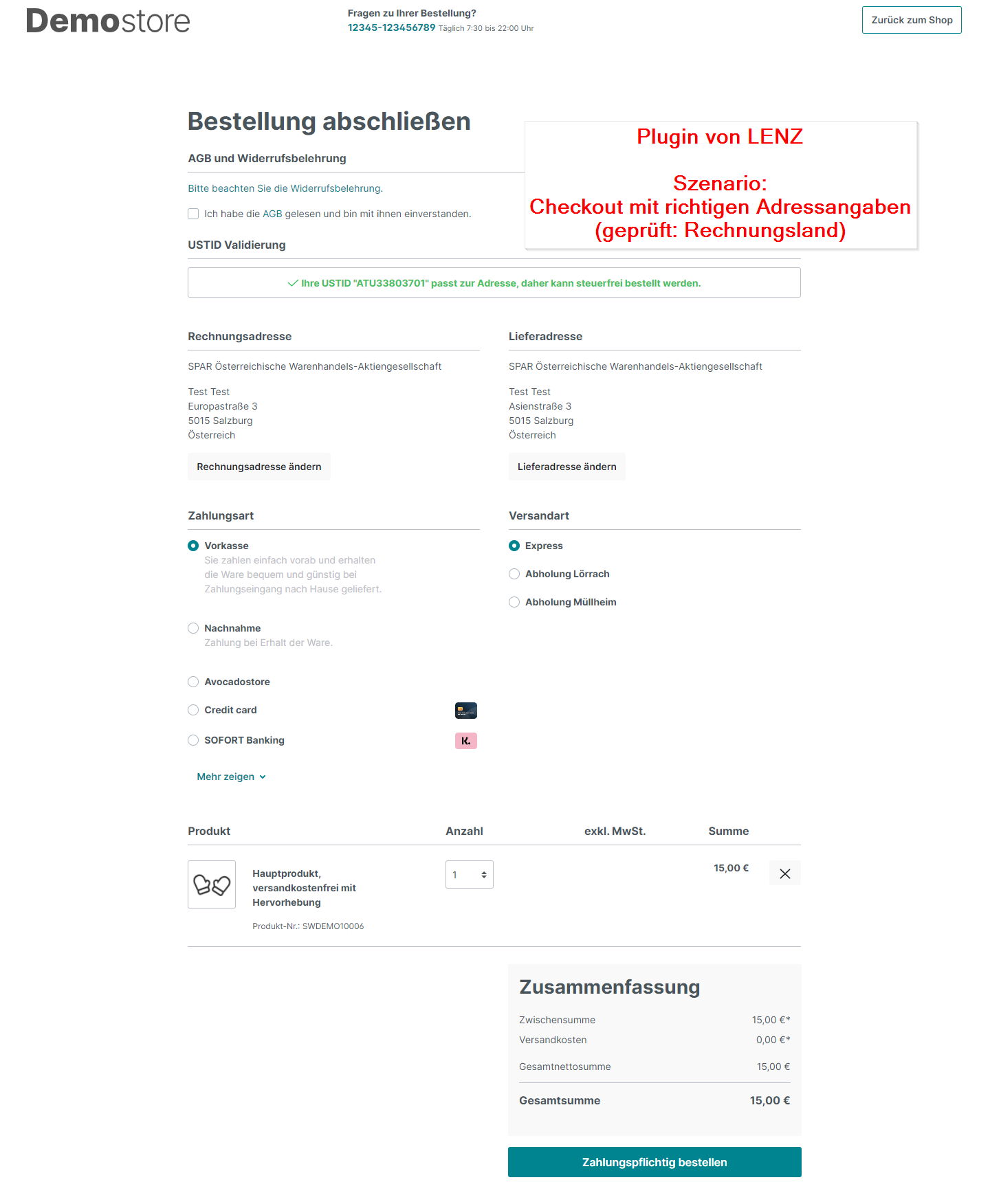 | Checkout mit richtigen Adressangaben (mit abweichender Lieferadresse) | Bestellung kann normal abgeschlossen werden, da die Rechnungsadresse geprüft wird | Geprüft: Rechnungsland Hinweis erscheint: „Ihre USTID „..“ passt zur Adresse, daher kann steuerfrei bestellt werden.“ |