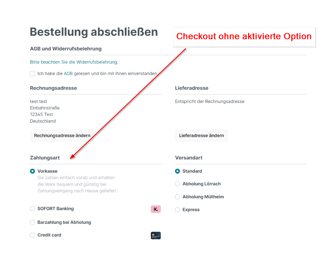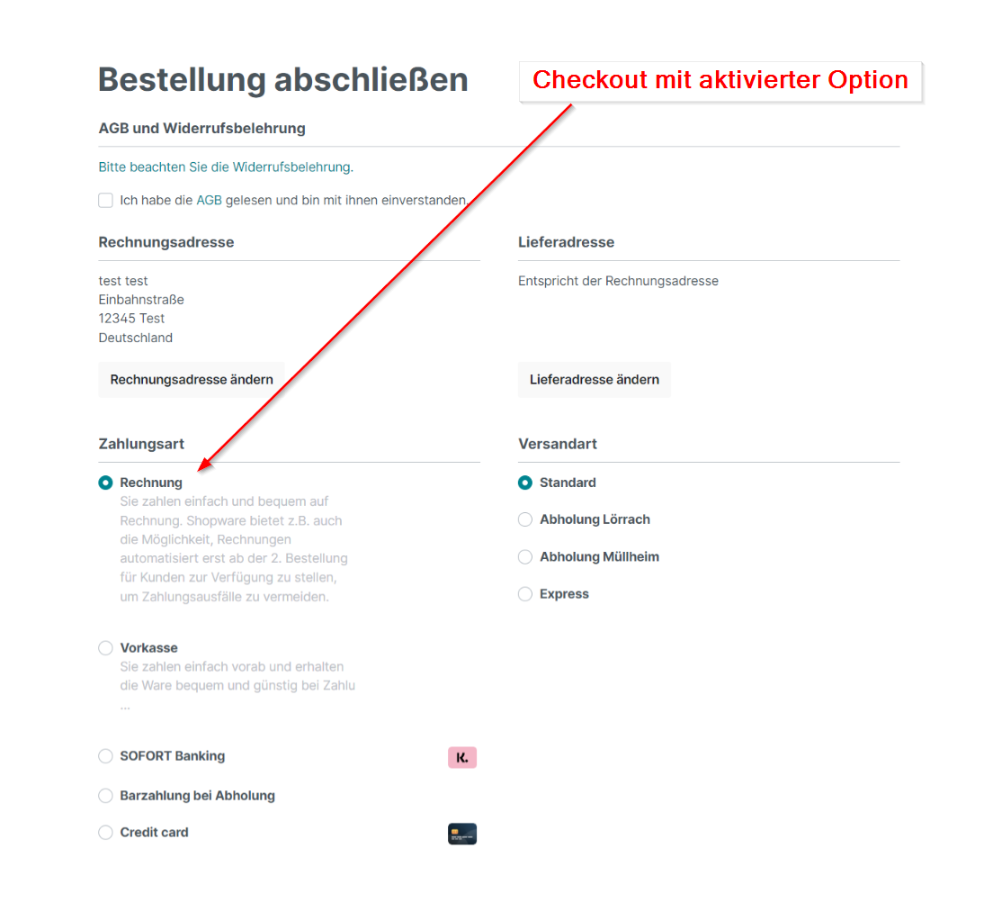 Im Anschluss wird nun dem Kunden im Checkout als zusätzliche Zahlungsmethode der Kauf auf Rechnung angezeigt.